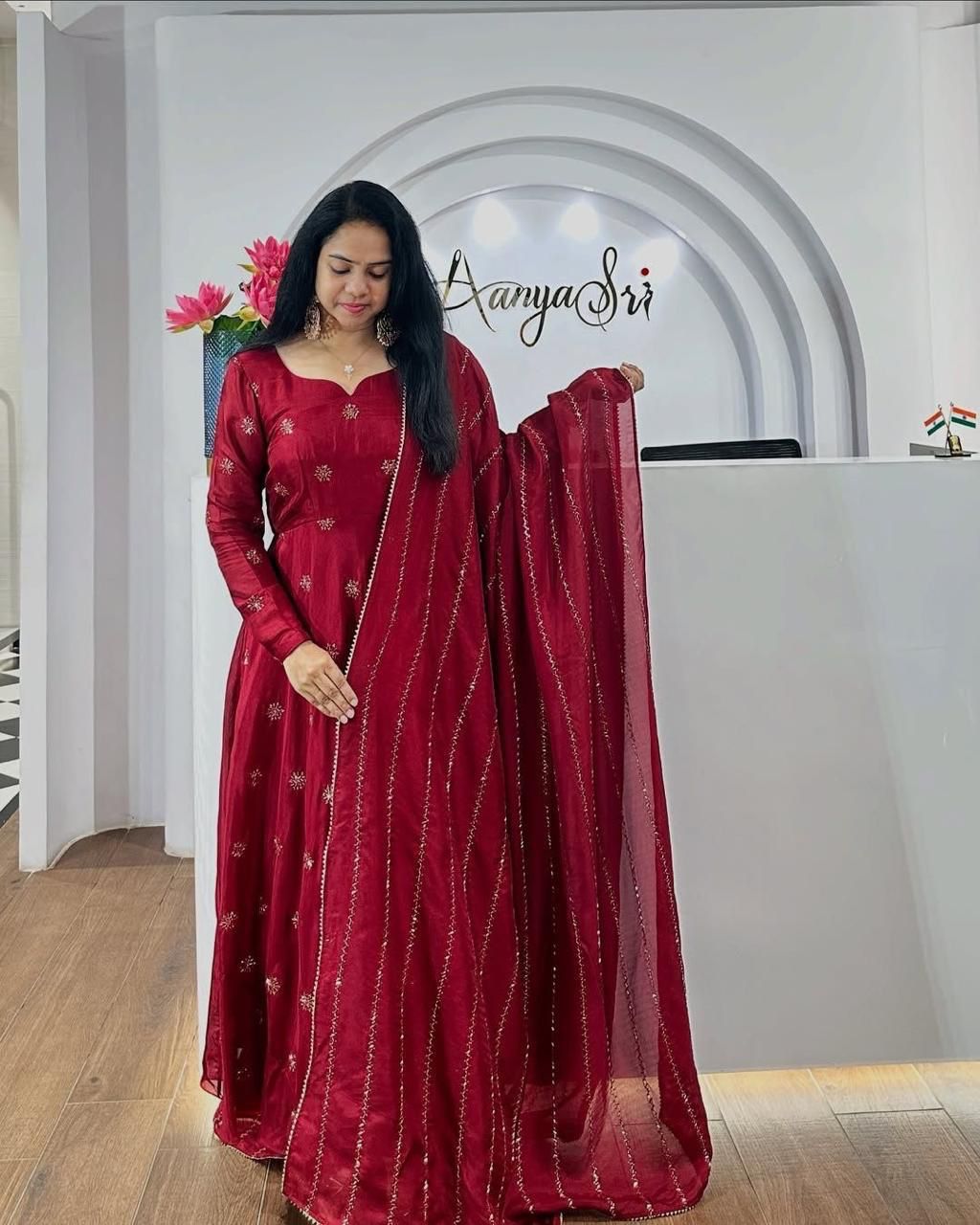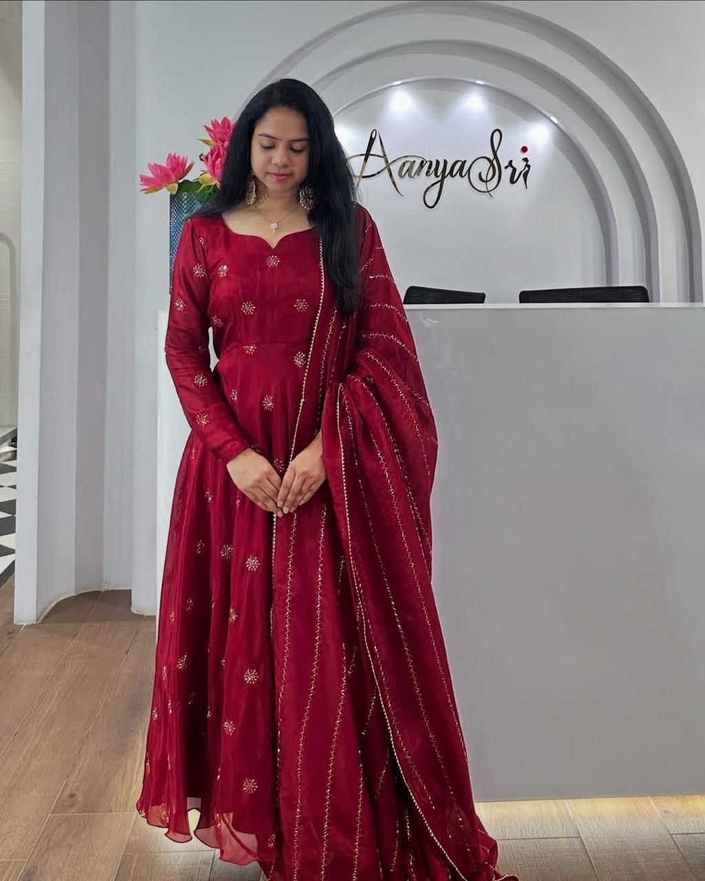 A beautiful traditional Indian outfit in a deep shade long Anarkali kurti with duppata set