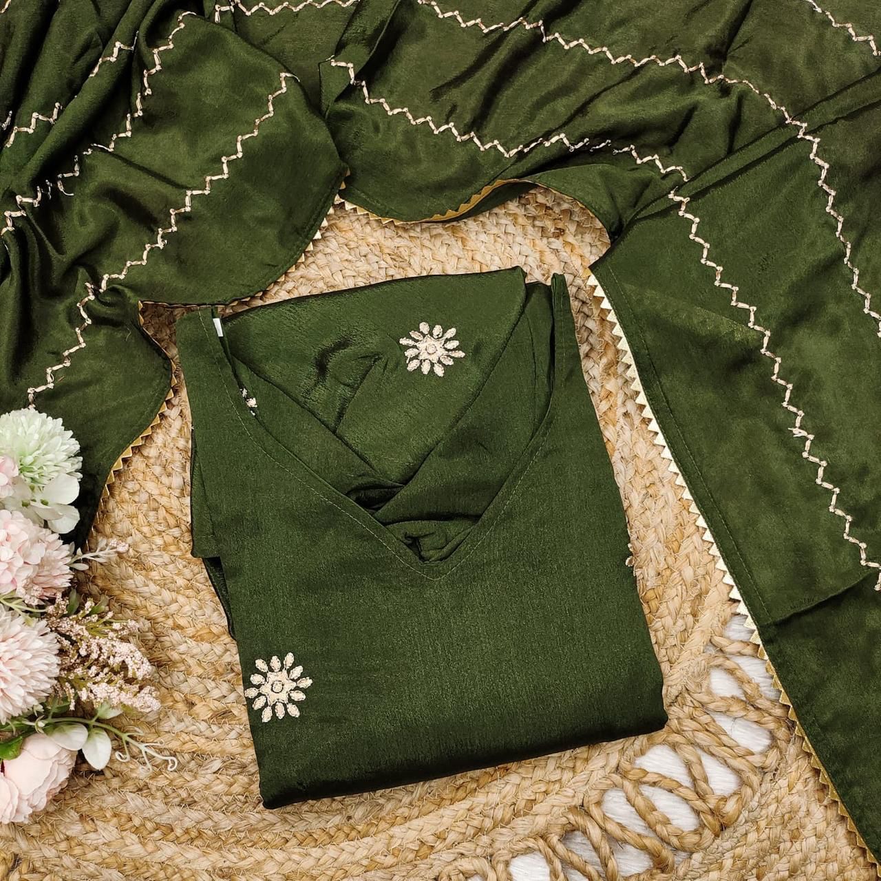 *The fabric used for both the kurti and dupatta is chinon, which has a soft and flowy texture. 💗There is intricate embroidery work all over the kurti and dupatta, 💝featuring delicate golden motifs. The dupatta is adorned with a finely crafted border, enhancing its elegance.* *
