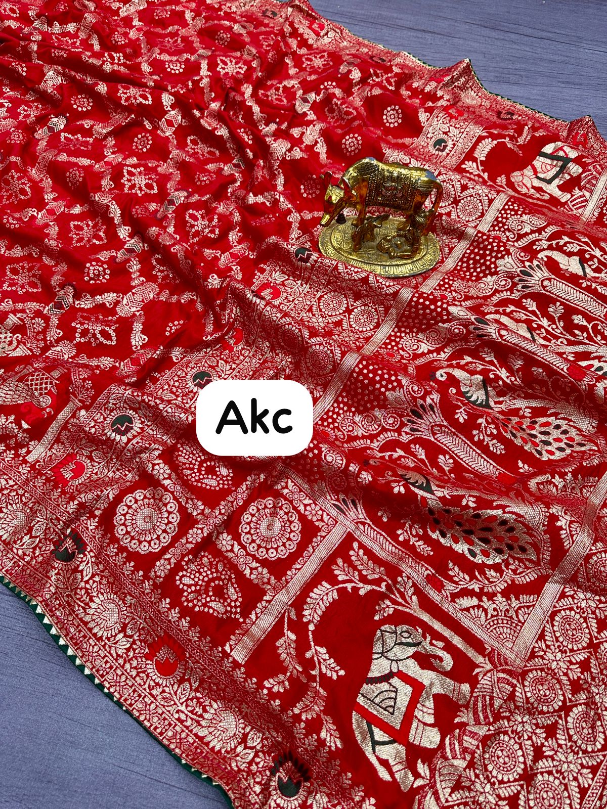 The saree features an intricate all-over flower bandhani design, which gives it a unique and classic look.