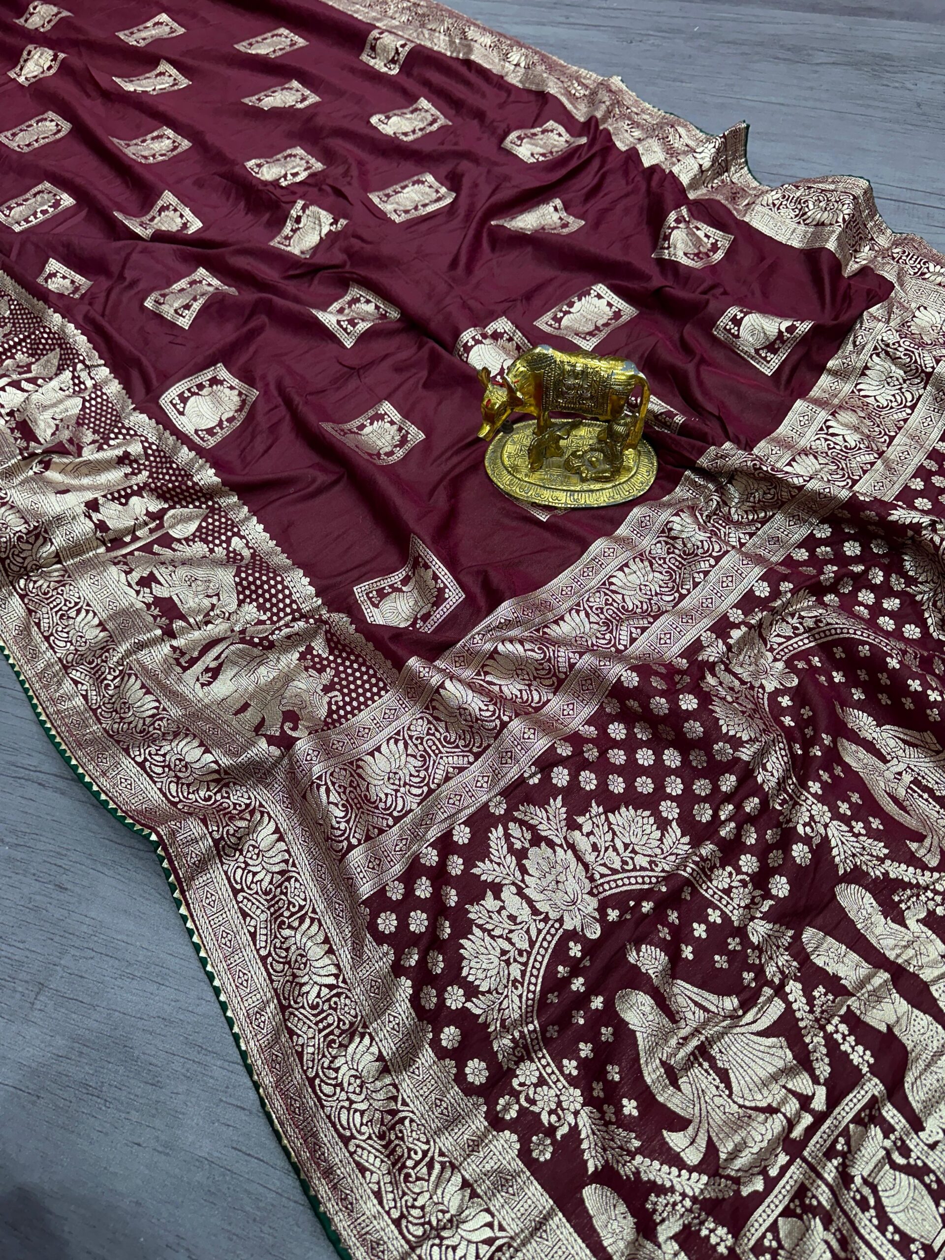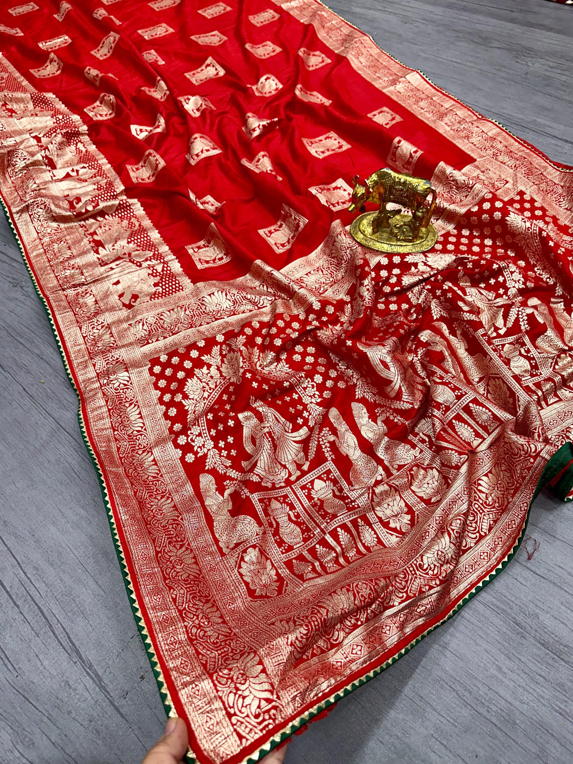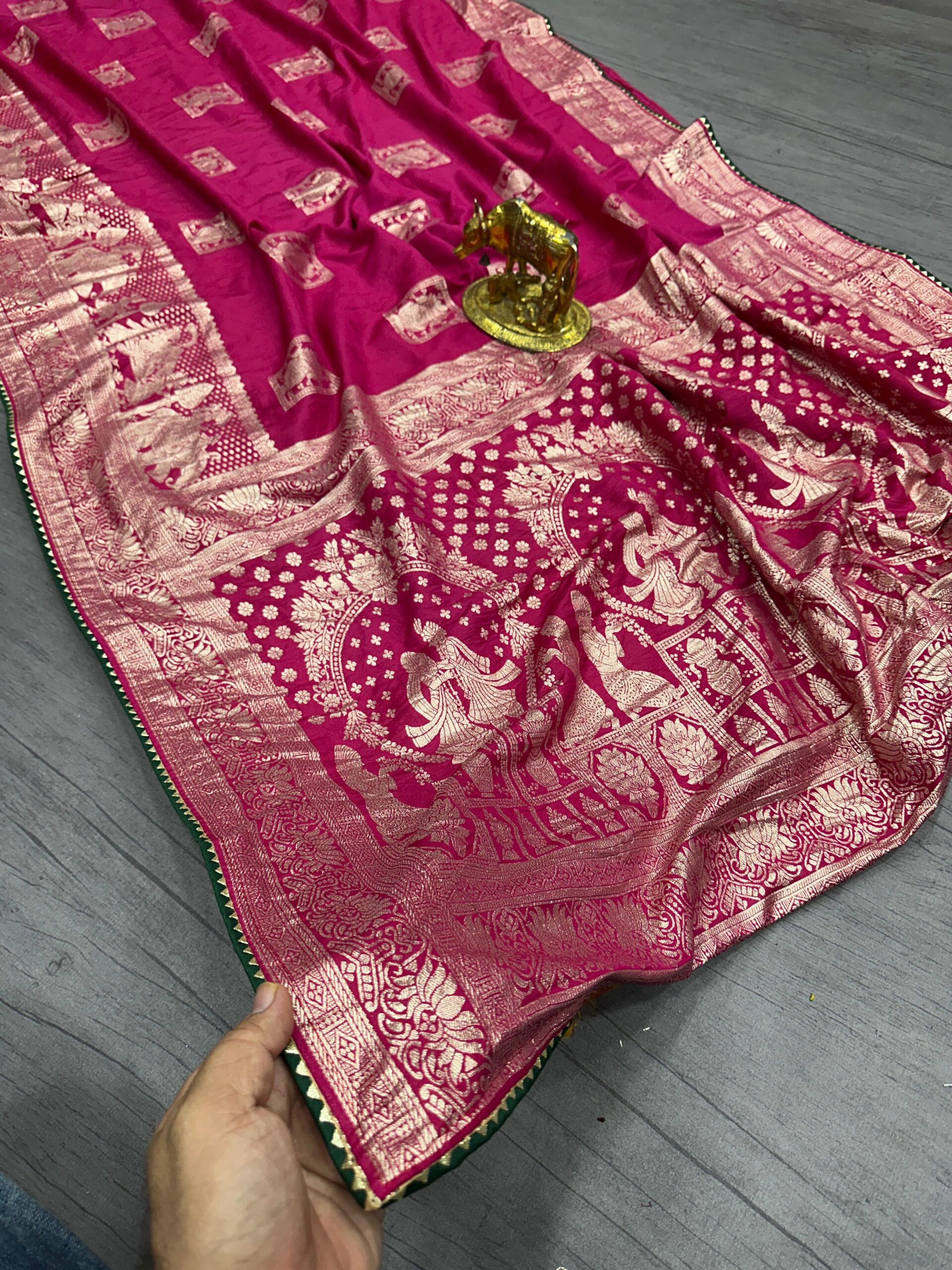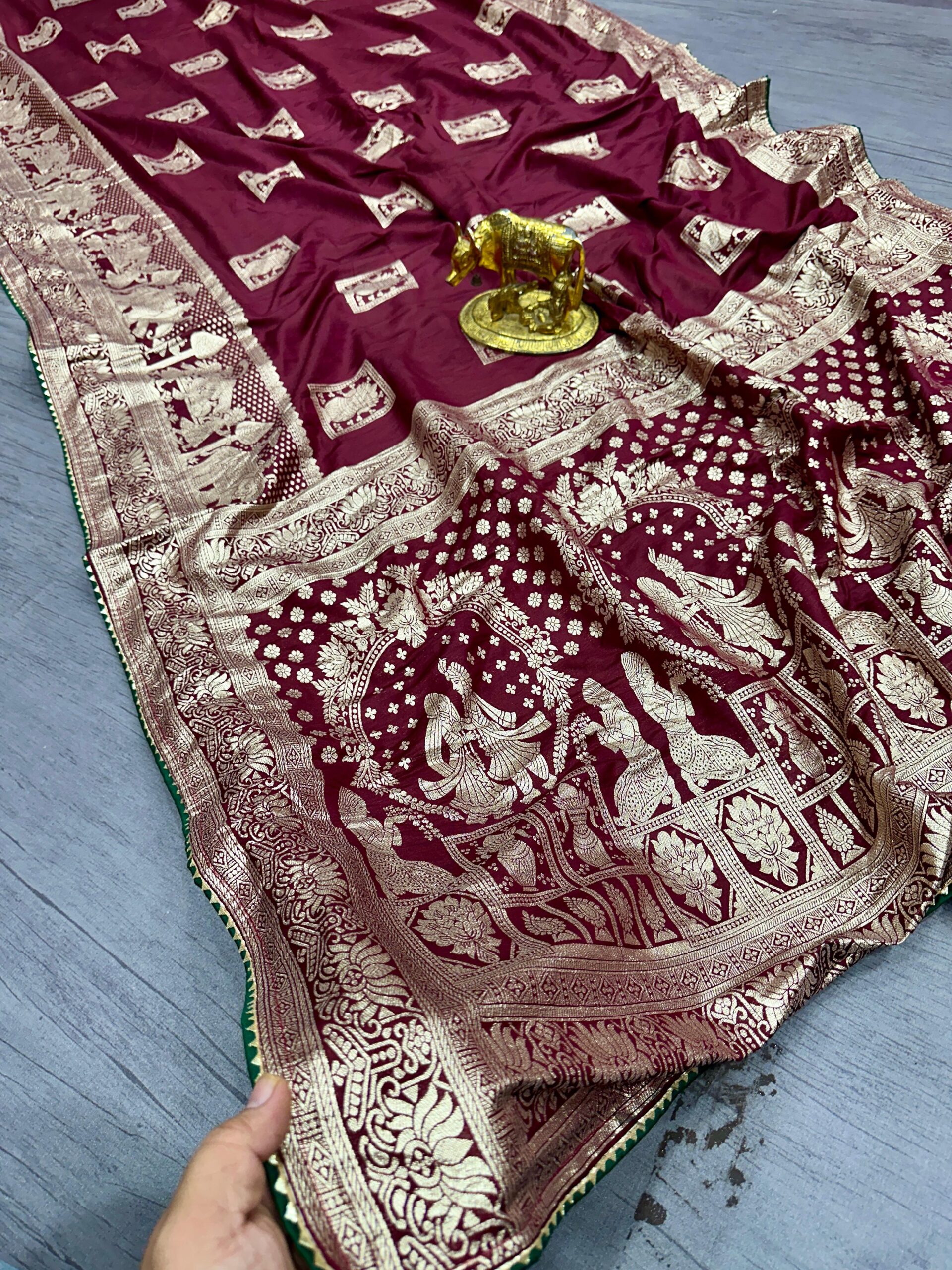 Saree :~ Pure Dola silk with Zari weaving Saree with zarkan Pallu border & samosa lace border